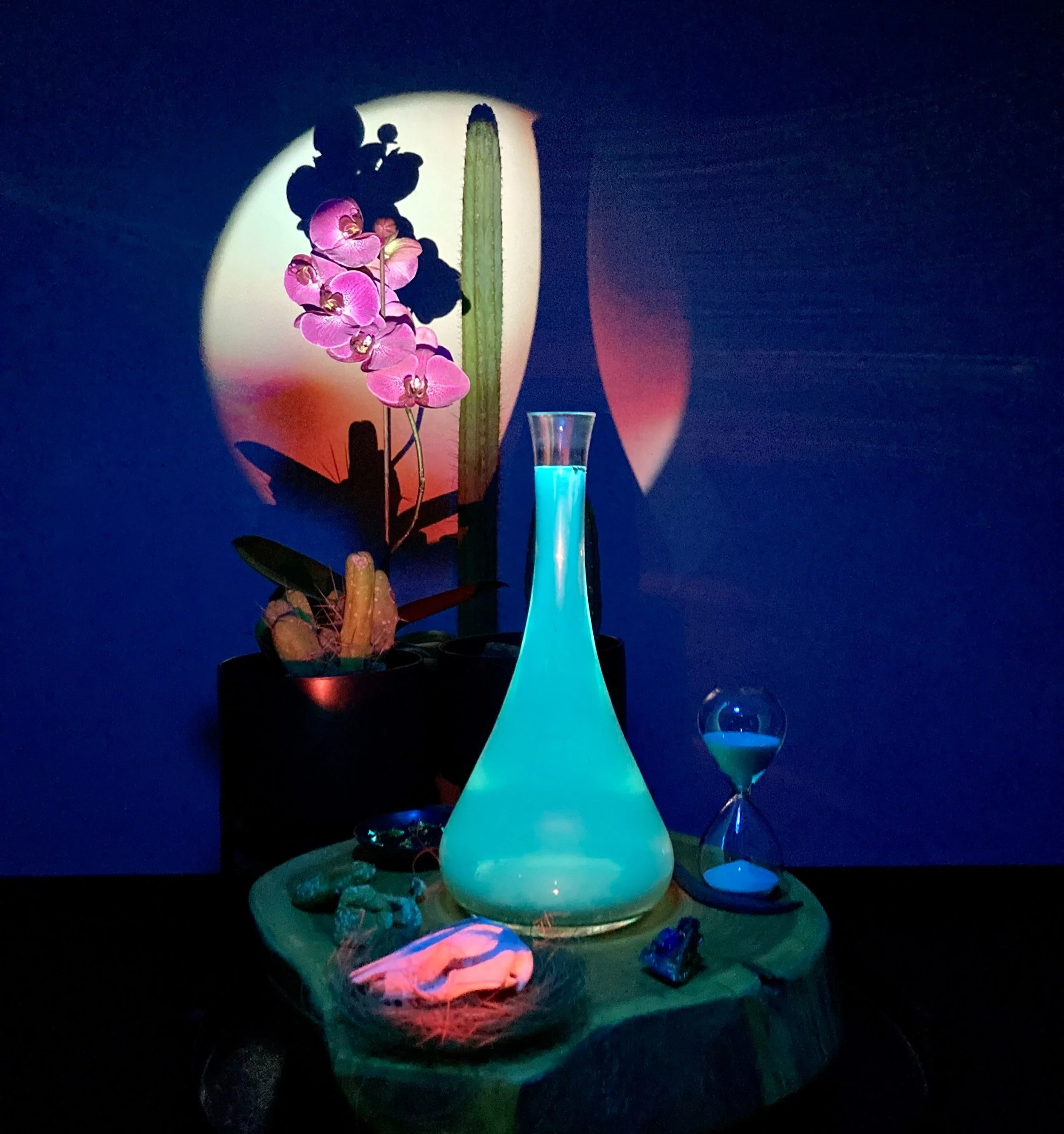 A full moon illuminates a night garden of intoxicating plants. Microscopic seeds ward off the evil eye and glow in ultraviolet, iridescent insect vision. Sunlight bathes the tree of chills, pages of an ancient herbal turn, flames flicker while machine ghosts are summoned through waves and ether.